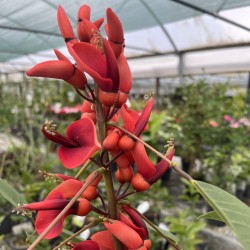 Evergreen semi-upright slender shrub. Tubular orange red flowers with flared mouths, appear in dense clusters from early summer. Needs full light/partial shade and fertile well drained soil. 2-3ltr pot