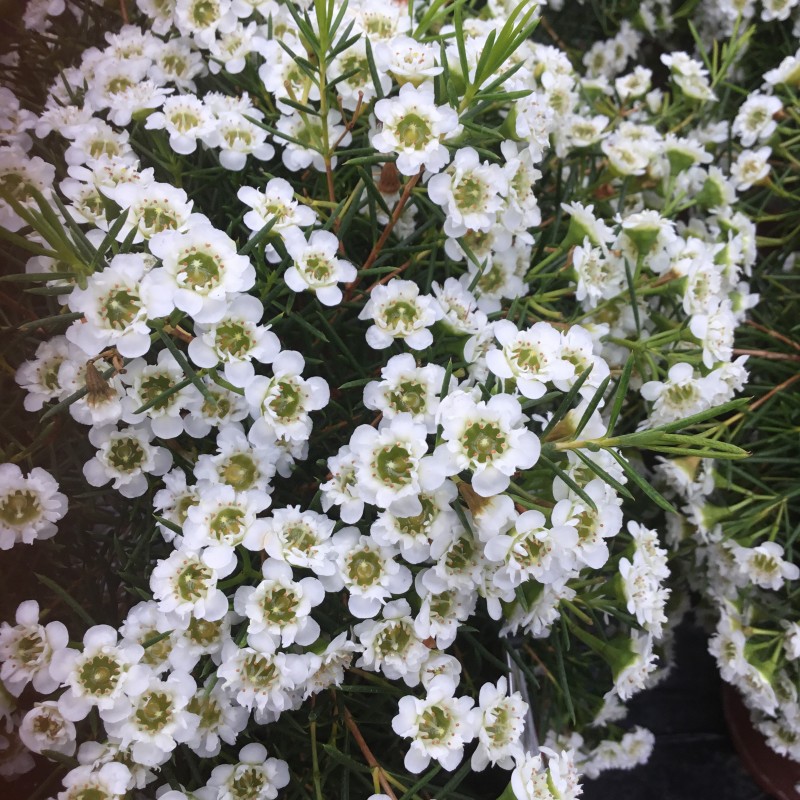 Abundant flowering Geraldton Wax with snow white flowers and fresh lime foliage. Plant in a sunny spot in well drained soil to enjoy masses of snow-white blooms. 15cm pot