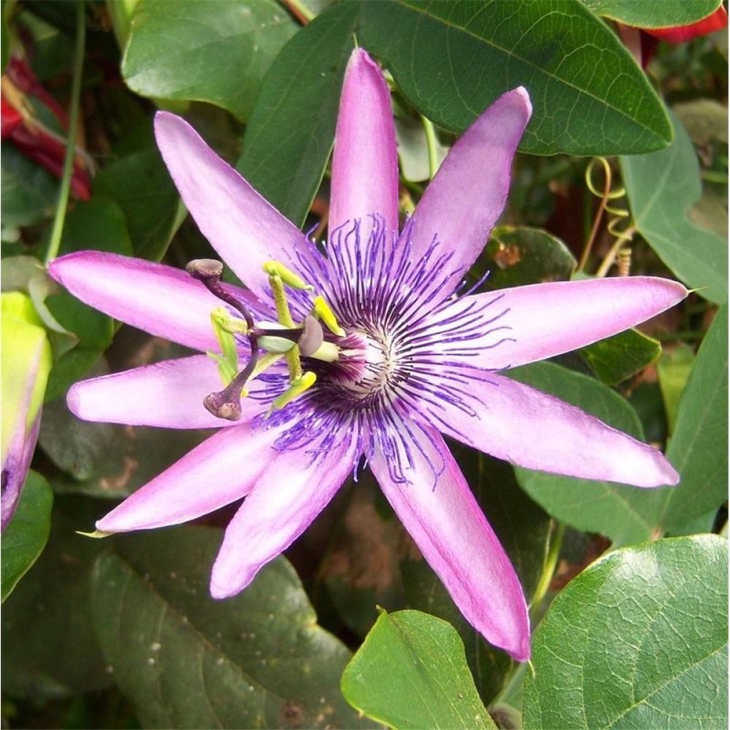 Passion Flower. A vigorous climber with rich green leaves and lavender coloured bowl-shaped flowers with green anthers. Suitable for outdoors in a mild area.