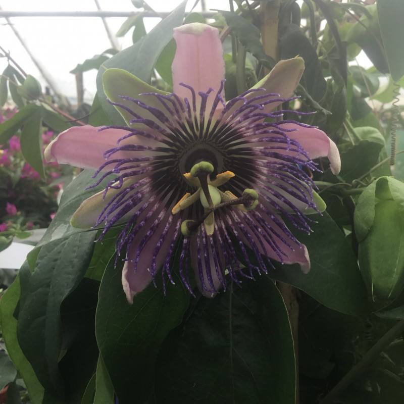 ‘Monique Klemann’ (P. × decaisneana × P. caerulea) C. Laurens hybrid. A lovely scented Passiflora with large three lobed leaves and showed large deep pinkish mauve scented flowers. 2ltr pot.