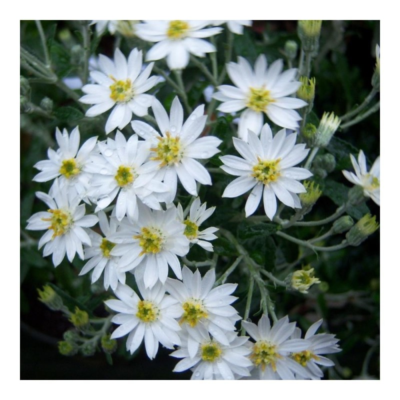 Daisy Bush. An upright shrub narrow oblong wavy-edged grey leaves and dense clusters of white flowers.3ltr