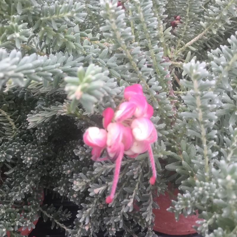 Woolly Grevillea. A low growing variety to approx 30cm soft fine leaves and red,pink and white flowers through Spring to Summer. 15cm pot.