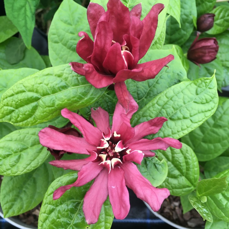 A choice rare plant 'Hartlage Wine' is a multi-stemmed shrub with upright to arching branches, oval leaves carried in pairs and aromatic bark. The flowers are wine-red touched with cream in the centre, lightly scented and produced over a long period from early to late summer. 3ltr