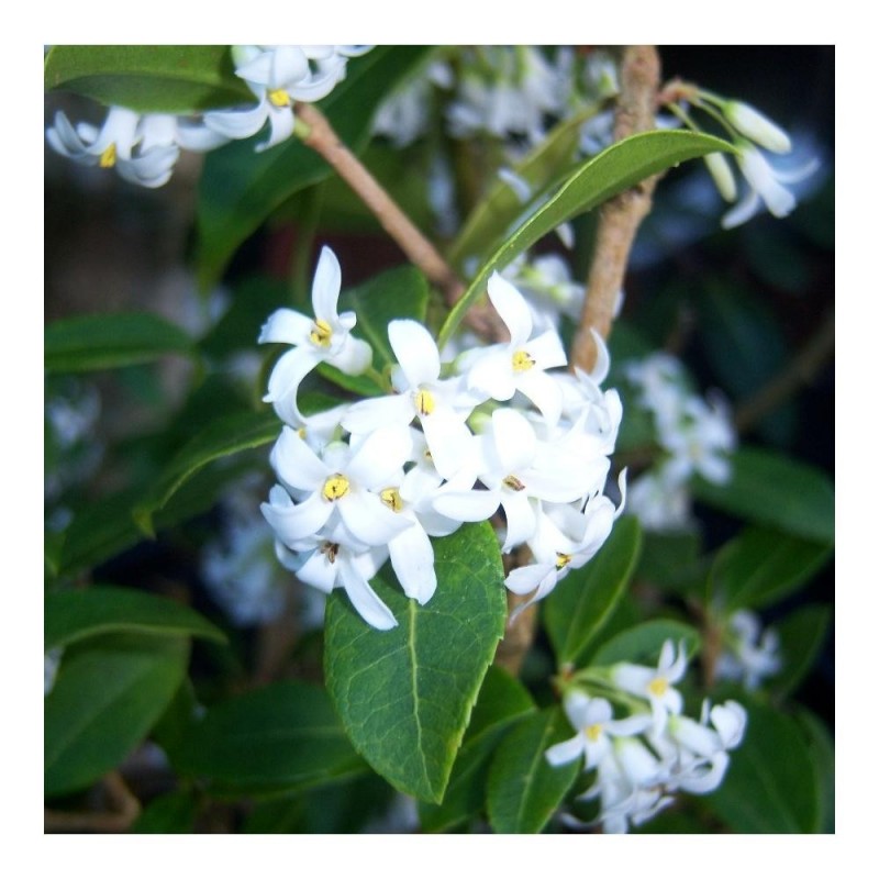 A superb evergreen shrub. Great in it's own right as a specimen or as a hedging plant. It has small smooth dark green leaves which provide the perfect foil for the white flowers. These appear from spring onwards in masses and are fragrant and jasmine like. Tough, hardy, any moist soil, sun/part shade.